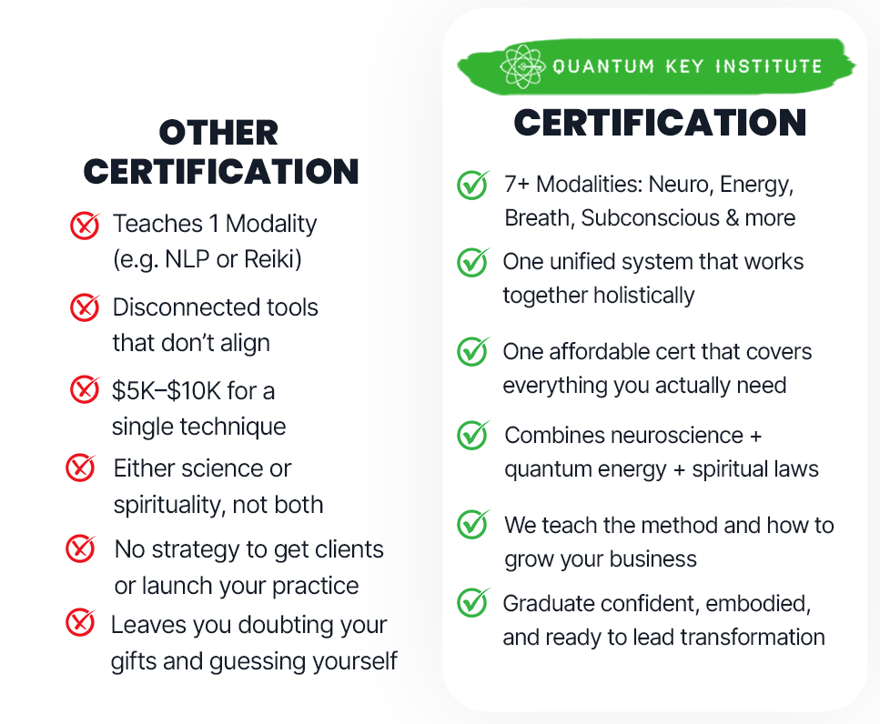Learn the best of Hypnotherapy, Breathwork, Life Coaching, Meditation, Quantum Physics, Somatic Coaching, Neuroscience and more — all in one comprehensive program.