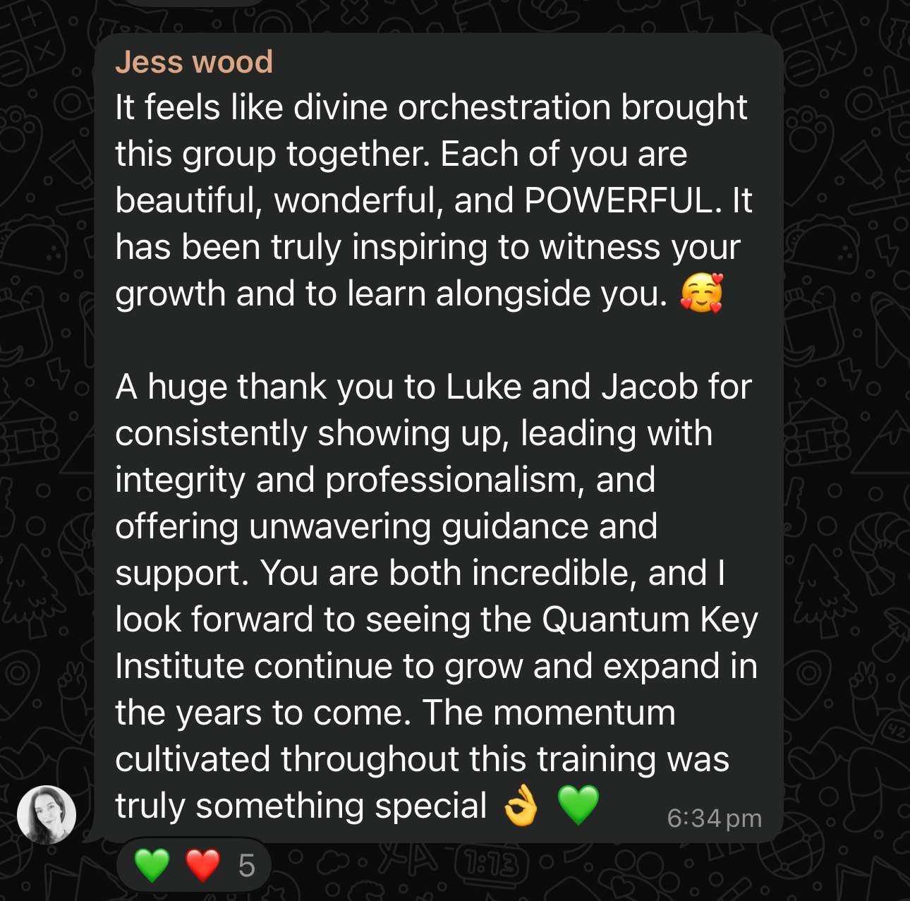 Together with his brother Jacob, Luke brings over a decade of combined experience in quantum healing, subconscious reprogramming, and business strategy - having guided over 3,000 individuals through life-changing inner work and personal breakthroughs.